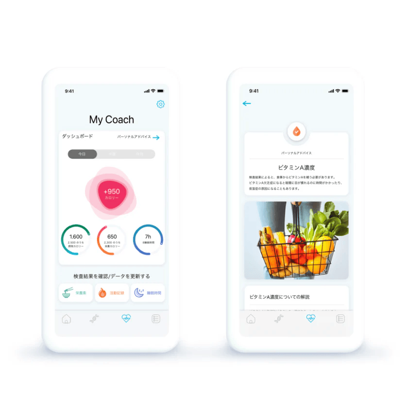 遺伝子検査の結果の閲覧機能。結果に基づいた健康管理アドバイスも豊富。